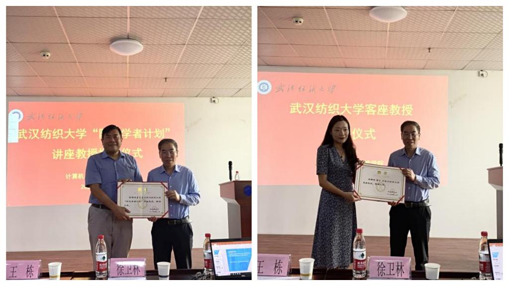 徐卫林为曾宪奕颁发“阳光学者”讲座教授聘书,为郭力颁发客座教授聘书。