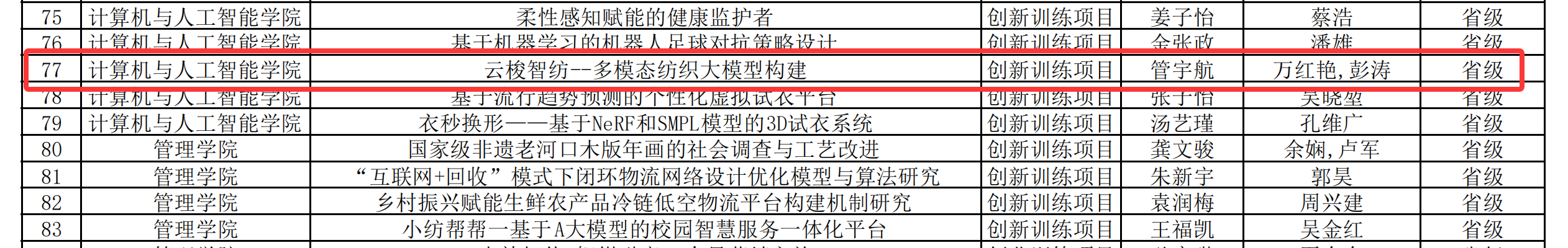 6月12日,公司创新创业公司公布了2025年老员工创新创业训练计划的获批项目清单,本年度获批项目总计170项,其中国家级30项、省级90项、校级50项。由2024级“拔尖创新班”管宇航、刘攀、黄汪洋等同学组成的员工团队,所申请的项目《云梭智纺--多模态纺织大模型构建》成功获批省级立项,该项目的指导老师为副经理彭涛教授和万红艳老师。
