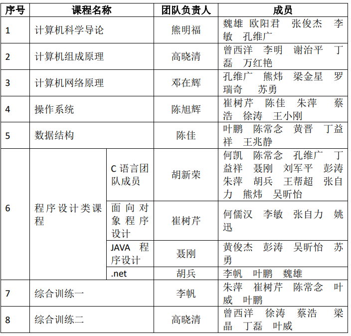 按照《402永利集团课程团队建设方案》,通过老师自愿报名,公司组织课程团队负责人说课,团队负责人和成员双向选择后确定计算机科学导论、计算机组成原理、操作系统等院管课程负责人及成员如下: