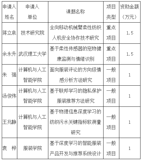 根据《纺织服装智能化湖北省工程研究中心开放课题申请与评审管理办法》,纺织服装智能化湖北省工程研究中心2022年度开放课题评审已圆满结束,感谢所有申请人对工程中心开放课题的关注。经本工程研究中心学术委员会专家审议,确定对以下6项开放课题予以立项资助。