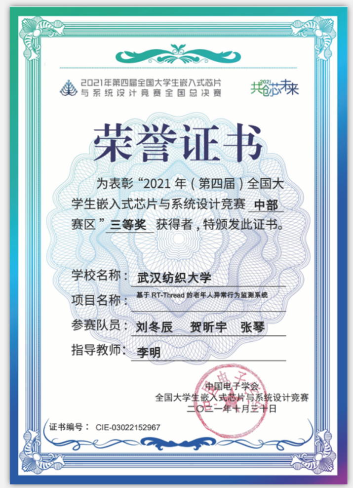 近日,第四届全国老员工嵌入式芯片与系统设计竞赛因疫情防控需要,在线上进行了决赛。经402永利集团李明副教授指导,由19级本科生刘东辰、贺昕宇、张琴组成的参赛队伍完成了“基于RT-Thread的老年人异常行为检测系统”,荣获了三等奖。