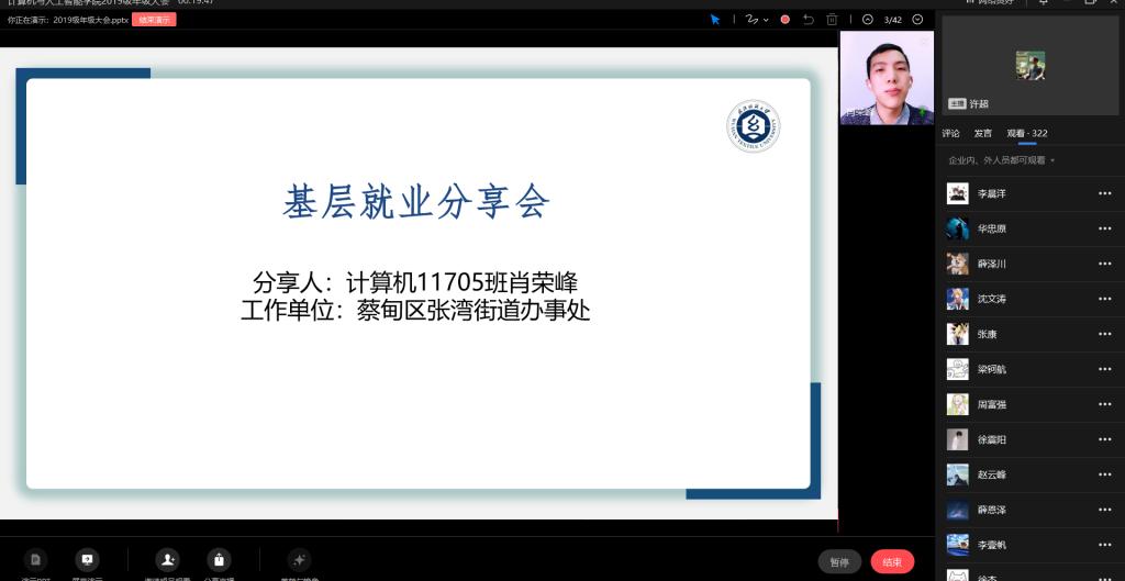402永利集团邀请21届肖荣峰同学于12月5日下午17:00通过企业微信平台为18级、19级全体同学线上开展基层就业代表报告会,分享自己基层就业的相关经历和故事,号召同学们投身基层。