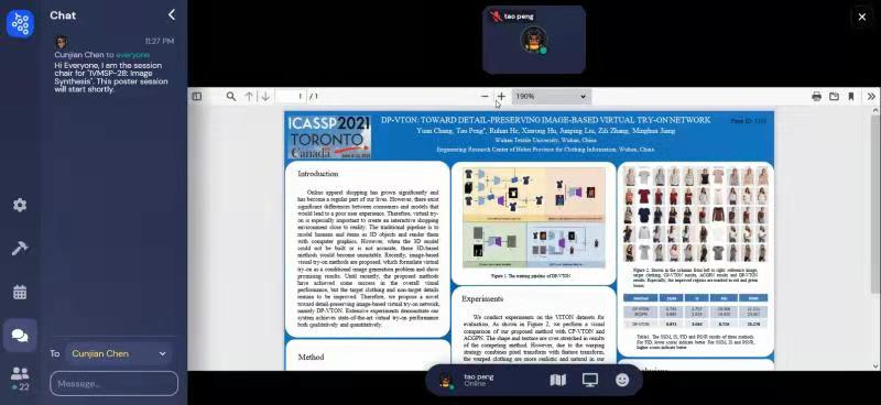ICASSP2021会议于6月6日至6月11日在加拿大线上召开,ICASSP会议即国际声学、语音与信号处理会议,是全世界最大的,最全面的信号处理及其应用方面的顶级会议,也是CCF(中国计算机学会)推荐的B类会议。由彭涛副教授指导2019级硕士研究生常源同学撰写的关于服装的虚拟试衣的论文被接收并受邀做口头报告,彭涛副教授代表课题组对论文进行了介绍并与参会者进行了详细讨论。