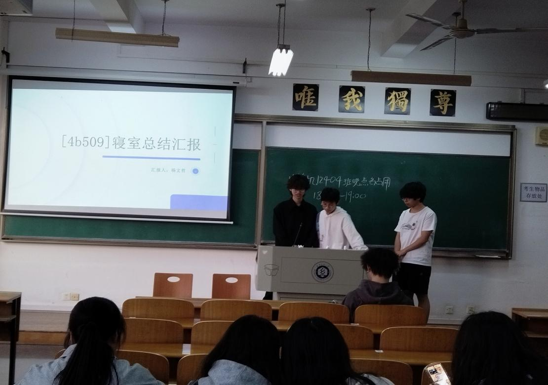 4B508 寝室长李龙宇表示在对上学期的学业总结中,寝室成员的整体表现有喜有忧。尽管大部分成员都顺利通过了所有课程,但仍有一位成员不幸挂科,这给他们敲响了警钟。在荣誉方面,他们寝室在上一学期被评为“优秀寝室”,这是对他们共同努力和良好氛围的认可。针对上学期的表现,他们决心作出改变:短期内先学好专业课,打好高数基础,英语考过四六级,培养良好学习习惯以争取考研成功!!!