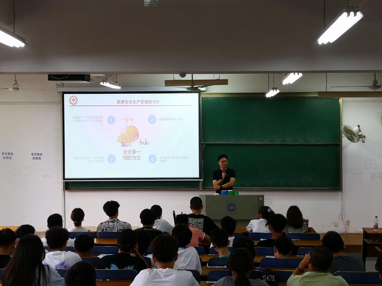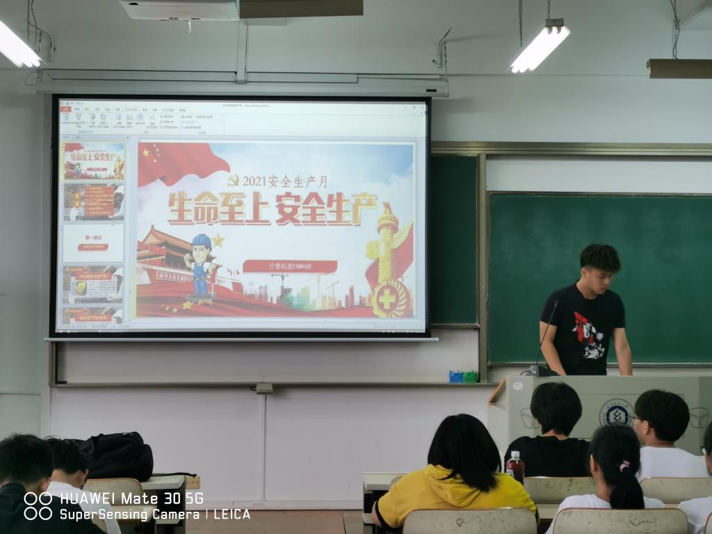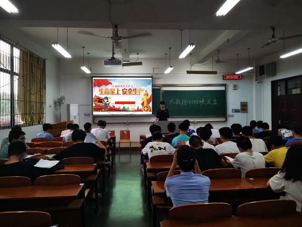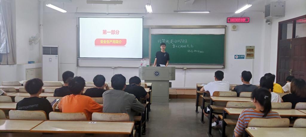 会上,辅导员许超带领大家认识校园安全隐患,其中包括用电安全,盗窃,防骗,交通安全等,介绍了什么是“安全生产月”,要做到落实安全责任,推动安全发展,希望全体员工通过此次班会掌握安全知识,培养“珍爱生命,安全第一”的思想。在大会中,还讲述了我国安全生产管理的方阵,“安全第一,预防为主”,“安全是生产经营活动的基本条件”。