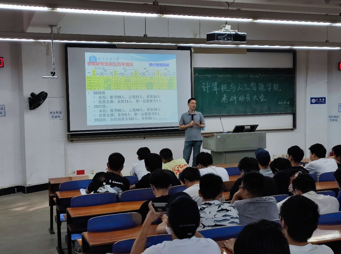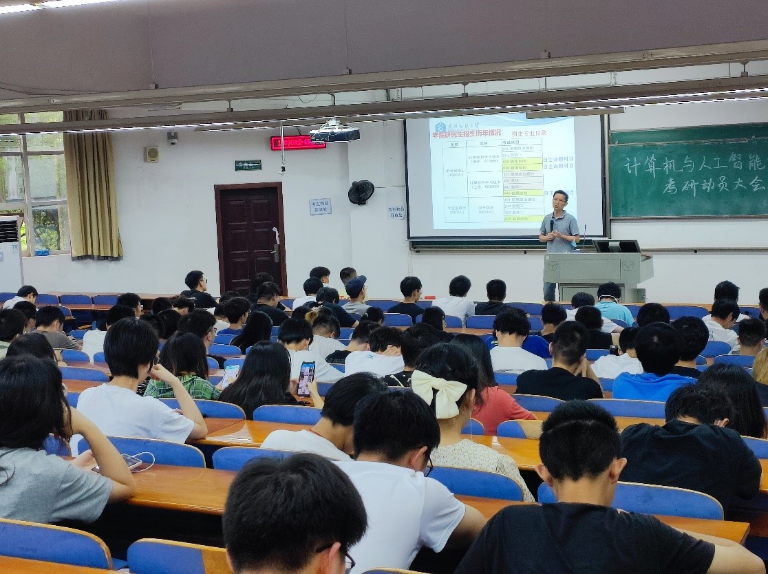 会上,彭涛教授详细介绍了近几年全国以及公司相关专业考研招生的整体情况,分析了公司19级本科生在考研过程中将要面临的形势和困难,并给大家提出几点建议:一是要综合评估自身实力,确定合理目标,理性择校;二是要制定科学的复习计划,持之以恒,不要打疲劳战;三是要不忘初心,脚踏实地,劳逸结合,保持身心健康。