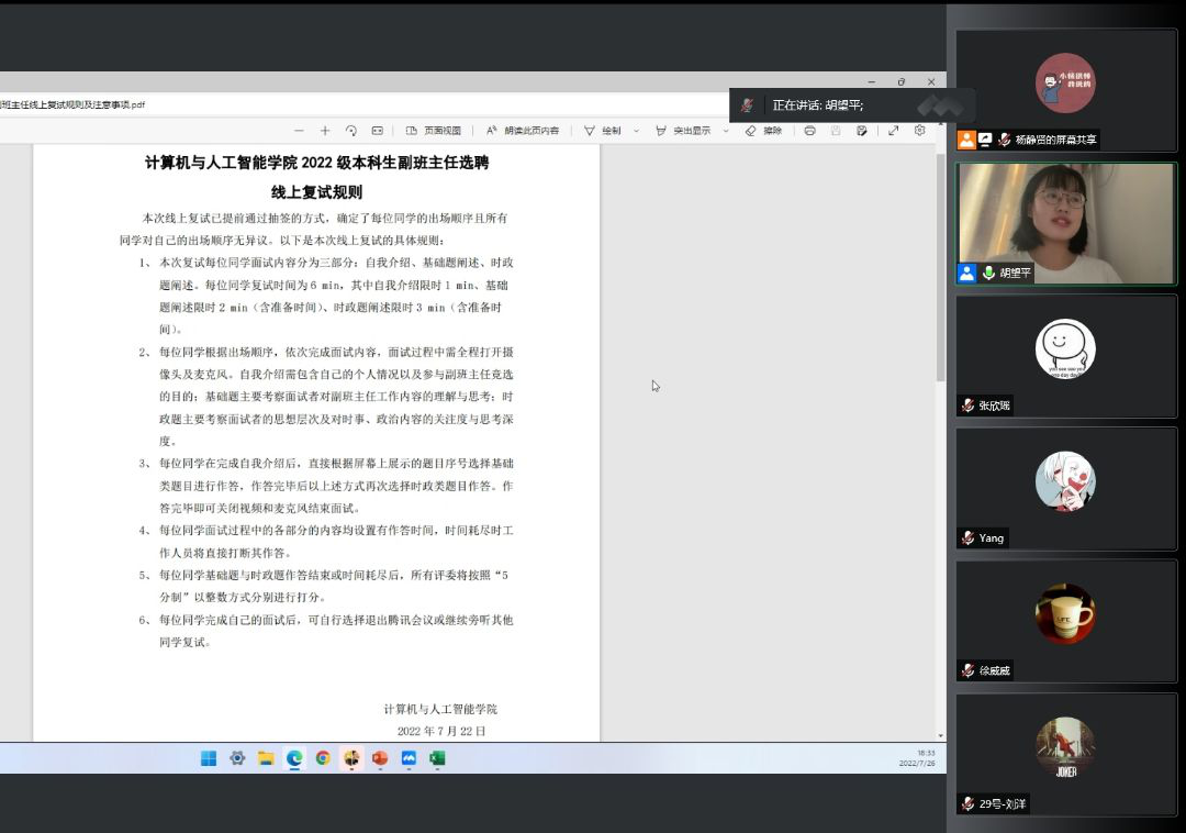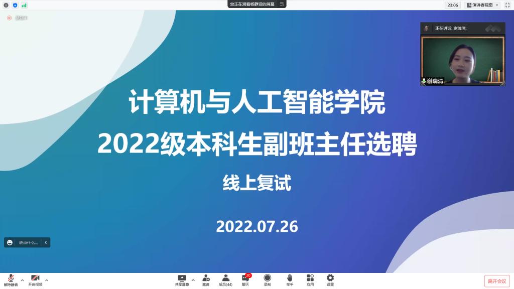 为了协助公司更好地开展2022级新生的教育管理工作,引领新生更快更好地适应老员工活,7月26日晚,2022级副班主任复试以线上的方式有条不紊地展开。2022级本科生辅导员廖龙、2021级辅导员谢瑞清、院员工会主席团成员梁鸣岩以及2021级副班主任杨静贤共同担任评委,线上复试由院员工会主席团成员胡望平主持。