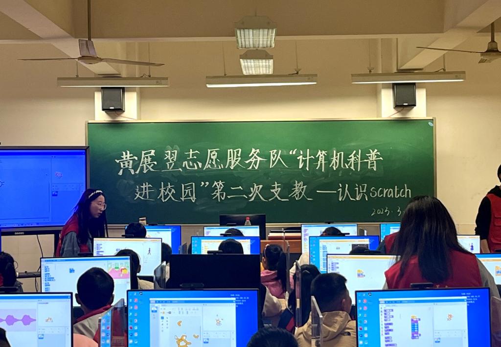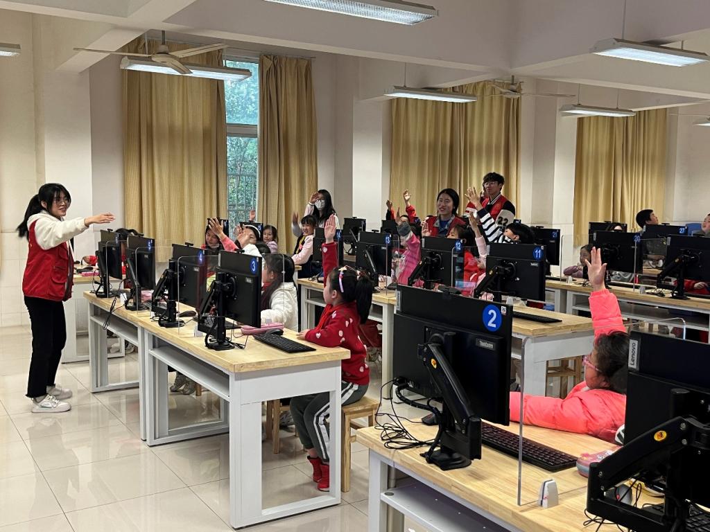 此次活动的地点在多媒体教室,便于孩子们亲自动手体验计算机带来的乐趣。志愿者利用视频文件向孩子们展示了计算机的发展历史和进程,详细讲解了计算机硬件相关基础知识,以图片动画的形式展示了计算机所运用的领域,志愿者小老师们还制作了生动有趣的课件和scratch编程系统,手把手教会孩子们用编程思想使电脑前的“小猫”完成各种指令,这极大地激发了孩子们的编程兴趣和创造性思维,让孩子们在“玩中学,做中学”,感受科学的魅力。