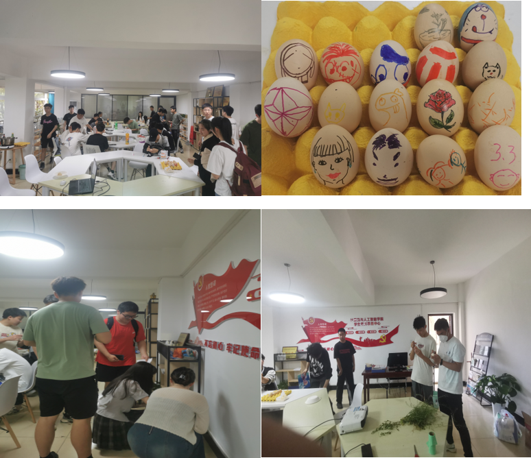 活动中午12点正式开始,辅导员薛敏向同学们介绍了三月三荠菜煮鸡蛋的来历和寓意,其他辅导员现场教导同学们具体操作流程,让同学们体验“叠鸟巢”和“鸡蛋画”的乐趣。