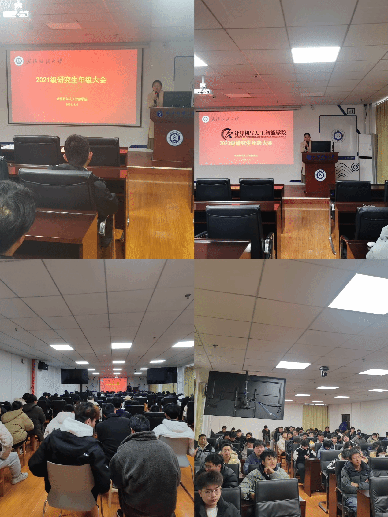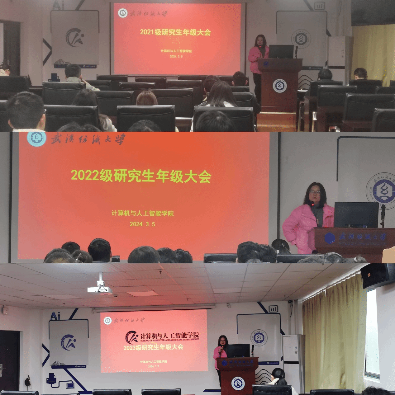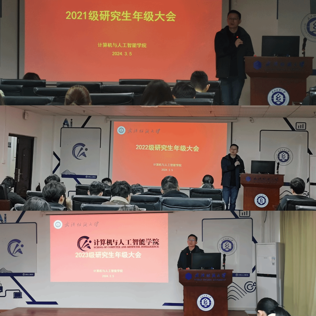 新学期伊始,为帮助研究生调整学习状态,明确本学期学习任务和目标,3月5日下午4:30-6:30在崇真楼南楼A4030依次召开研究生三个年级的年级大会。年级大会由公司副经理彭涛主持,教学秘书罗园、研究生辅导员余梦帆和全体研究生参与。
