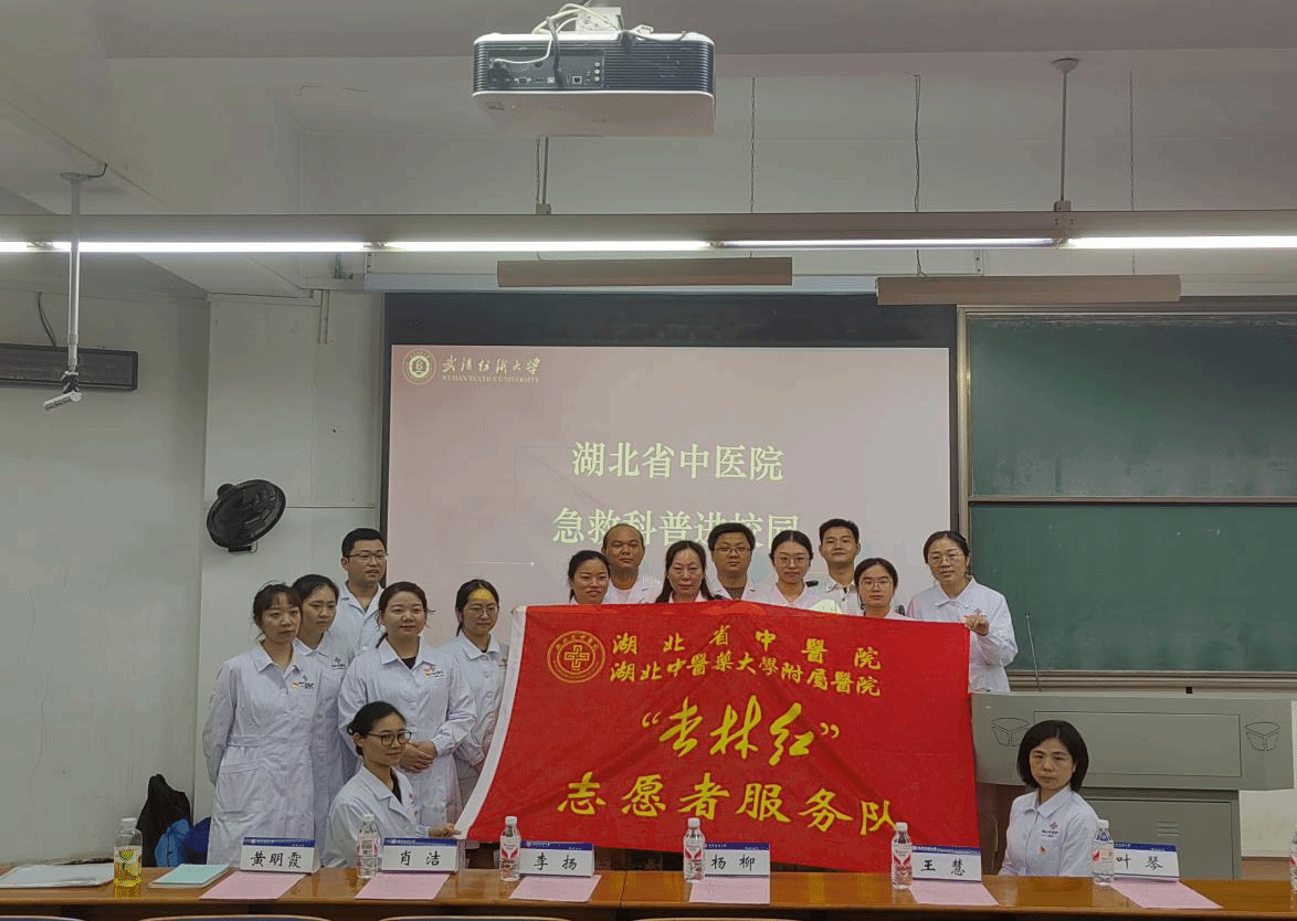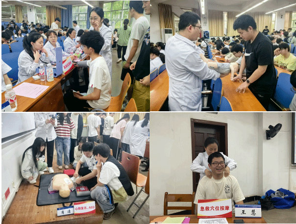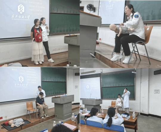 活动伊始,与会人员一起观看了湖北中医院宣传片,深入了解湖北省中医院的发展历程。随后,湖北省中医院急救志愿服务队的外科医生李博宁以深入浅出的方式,向同学们讲解了徒手心肺复苏、扭伤、骨折的初步处理、晕倒的处理。ICU医生龙琦结合自制的短视频向同学们详细讲解急性心梗的识别与急救,他着重强调掌握这些基本的急救技能,对于在紧急情况下挽救生命具有重要意义。护理专家黄明霞重点为同学们讲解了海姆立克急救法等紧急救护知识。