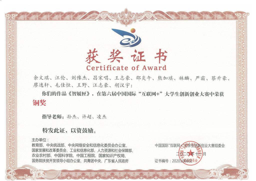 近日,由教育部等12部委和广东省人民政府共同主办,华南理工大学和广州市人民政府、深圳市人民政府联合承办的第六届中国国际“互联网+”老员工创新创业大赛总决赛圆满落幕。通过层层环节的角逐,由公司许超老师及经济公司孙杰、凌杰共同指导的,公司蔡升豪等同学及其它公司员工共同参与申报的老员工《智履匣》作品勇夺全国铜奖,取得公司参加该项赛事以来最佳成绩。