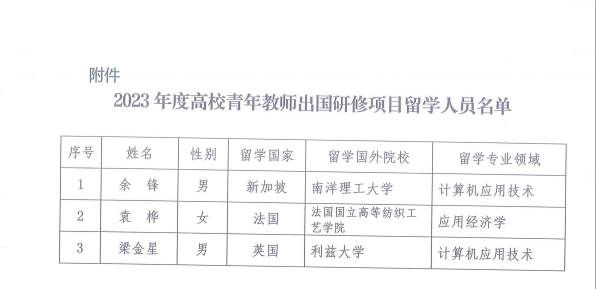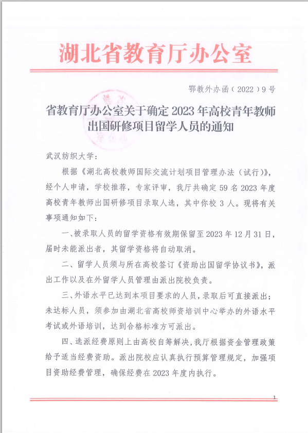 近日,根据湖北省教育厅《湖北高校教师国际交流计划项目管理办法(试行)》,经教师个人申请、公司考核、公司推荐、专家评审等环节,公司共有3名教师获批2023年公派出国留学项目,其中公司有余锋、梁金星2名教师获批。各类获批人员留学资格有效期至2023年12月31日。