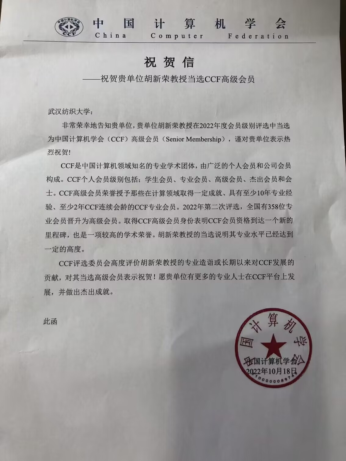 近日,中国计算机学会(CCF)向公司发来祝贺信,祝贺402永利集团胡新荣教授在2022年度会员级别评审中当选中国计算机学会(CCF)高级会员(Senior Membership)。