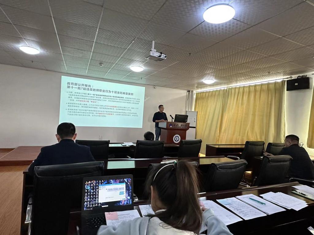会上,晏伟带领全院教职工认真学习《新时代高校职业行为十项准则》、《高等公司教师职业道德规范》等文件,并通报了教育部近期公布曝光违反教师职业行为十项准则的典型案例,以案说法,开展了警示教育活动。