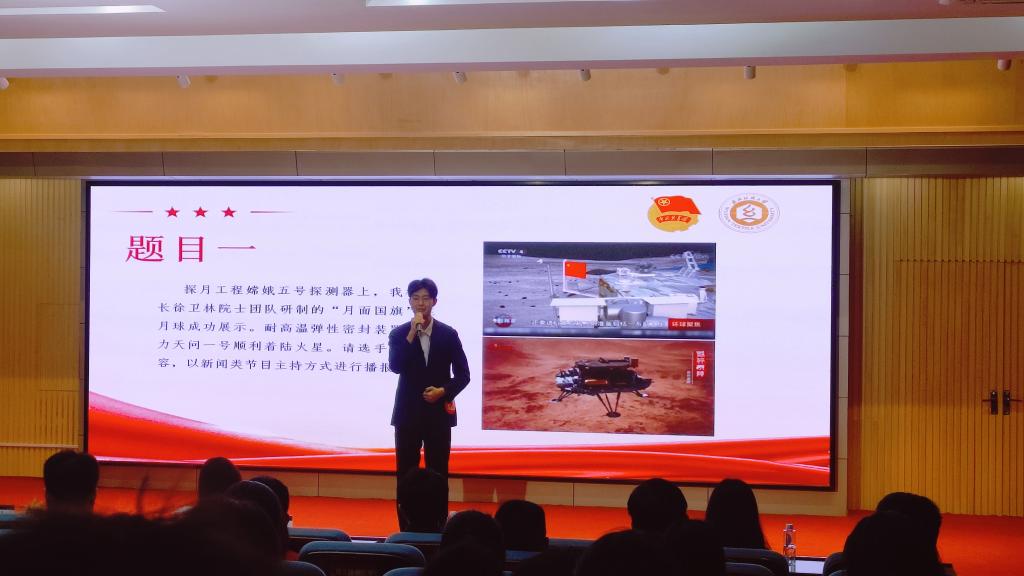 决赛分为两轮比拼,第一轮——“我是新时代好青年”,共有两个环节,一是个人风采展示,选手以视频短片形式,进行限时40秒的自我介绍和风采展示。二是自备稿件,选手进行限时3分钟的自备稿件展示。杨冠宇同学以《朗读者》为题,生动模拟主持情境,深度还原作品本真,声情并茂、情感真挚地带领全体观众体验了一场视听盛宴,最终在第一轮比拼中以第二的好成绩晋级第二轮比赛。第二轮——“我当新锐主持”,选手根据给定主题进行模拟主持,限时3分钟。杨冠宇同学以“董事长徐卫林院士团队研制的‘月面国旗’在月球成功展示”为素材,在扩充内容后以新闻类节目主持方式进行播报。他再一次以高超的语言组织能力、富有感染力的舞台表现能力赢得了阵阵掌声和评委的青睐。最终取得总成绩第三的好成绩,荣获二等奖。