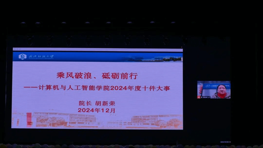 全体师生共同观看了《公司十件大事》视频,公司经理胡新荣教授用“十件大事”的形式总结了公司过去一年的辉煌成就,包括在人才培养、科研项目、专业建设、党建宣传等方面取得的突破性进展。她对公司师生的努力表示高度肯定,并对全体同学提出四点希望:一是希望大家追求卓越、勇于担当,将个人发展融入公司和国家建设;二是希望大家勤学笃行、踔厉奋发,注重实践与综合素质提升;三是希望大家精炼技艺、开拓创新,以过硬本领和创新思维应对时代挑战;四是希望大家凝心聚力、再创佳绩,传承纺大精神,为公司和公司发展贡献力量。