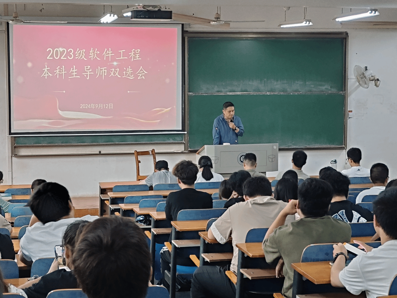 2024年9月12日下午,由402永利集团软件工程系主办的本科生导师双选会在崇志楼118教室举行。软件工程系主任叶鹏、软件工程系部分专任老师、辅导员易凡及全体2023级软件工程系员工参会,系主任叶鹏主持会议。